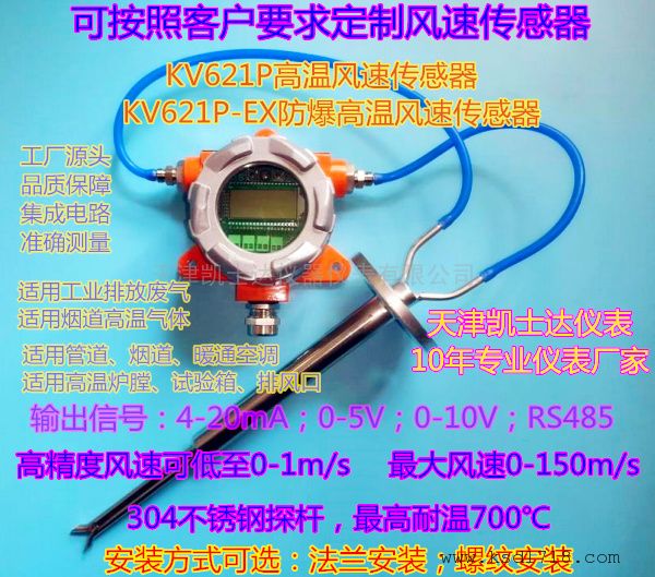 天津凯士达风速系列产品KV621P高温型风管风速风量传感器/变送器 管道风速传感器,可耐温200℃-300℃--500℃-600℃-700℃,是天津凯士达仪表有限公司历经多年潜心研发生产的一款通风管道插入式风速传感器。KV621P采用全量程标定,线性补偿和温度补偿均为数字化实现,可实现一键清零和手动测量值补偿。广泛适用于HVAC、通风系统、暖通空调、净化厂房,室验室、洁净厂房等风速测量。