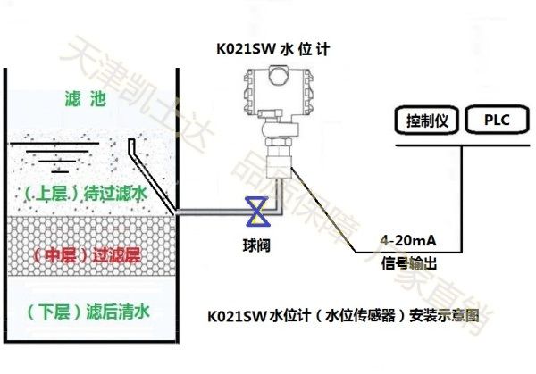 天津凯士达仪表精品K021ST滤池水位计K021ST滤池水头损失仪, 标准模拟量4-20mA 信号输出,分辨率0.001m,电源电压24V,可远传接入PLC、变频器及工业计算机或集散系统接口相连接,实现远程显示监测控制,产品采用进口芯片,精度高,测量准确,稳定性好,经精密温度补偿、放大处理,转换成4~20mA标准信号,广泛应用于自来水、污水处理厂滤水池,以及供水系统的快滤池、压力滤池水位以及水头损失的检测。 K021SW水位计(水位传感器)