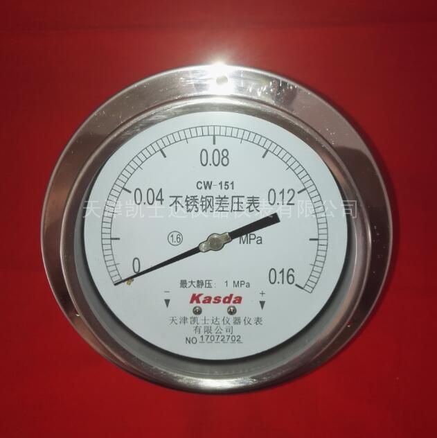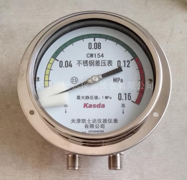 天津凯士达精品系列差压表/CWT-100-0.25-1-100mm/2.5级/0-0.25mpa,静压值1mpa,表圆直径100mm,可选带前边或者后边,适用于测量同一压力源或不同压力源的气体、液体或蒸汽等介质的压力差,并可用于对感压元件无腐蚀作用的腐蚀性介质。采用双波纹管感压,并配有温度补偿及单侧过载保护装置,具有感压精度高,稳定性好,工作压力高等优点。适用于高静压、低差压系统的差压测量,并可与节流装置配套测量流量(仪表标牌可制做成便于流量值读数的开方输出值),亦可用于密闭容器的液位测量。环境振动及介质脉冲较大时需采用充油耐振型产品,以使读数稳定,并可延长使用寿命。