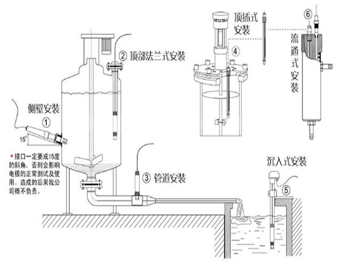 2. 侧壁安装:厂家提供带斜面的316L全不锈钢护套,pH电极旋入护套即可。