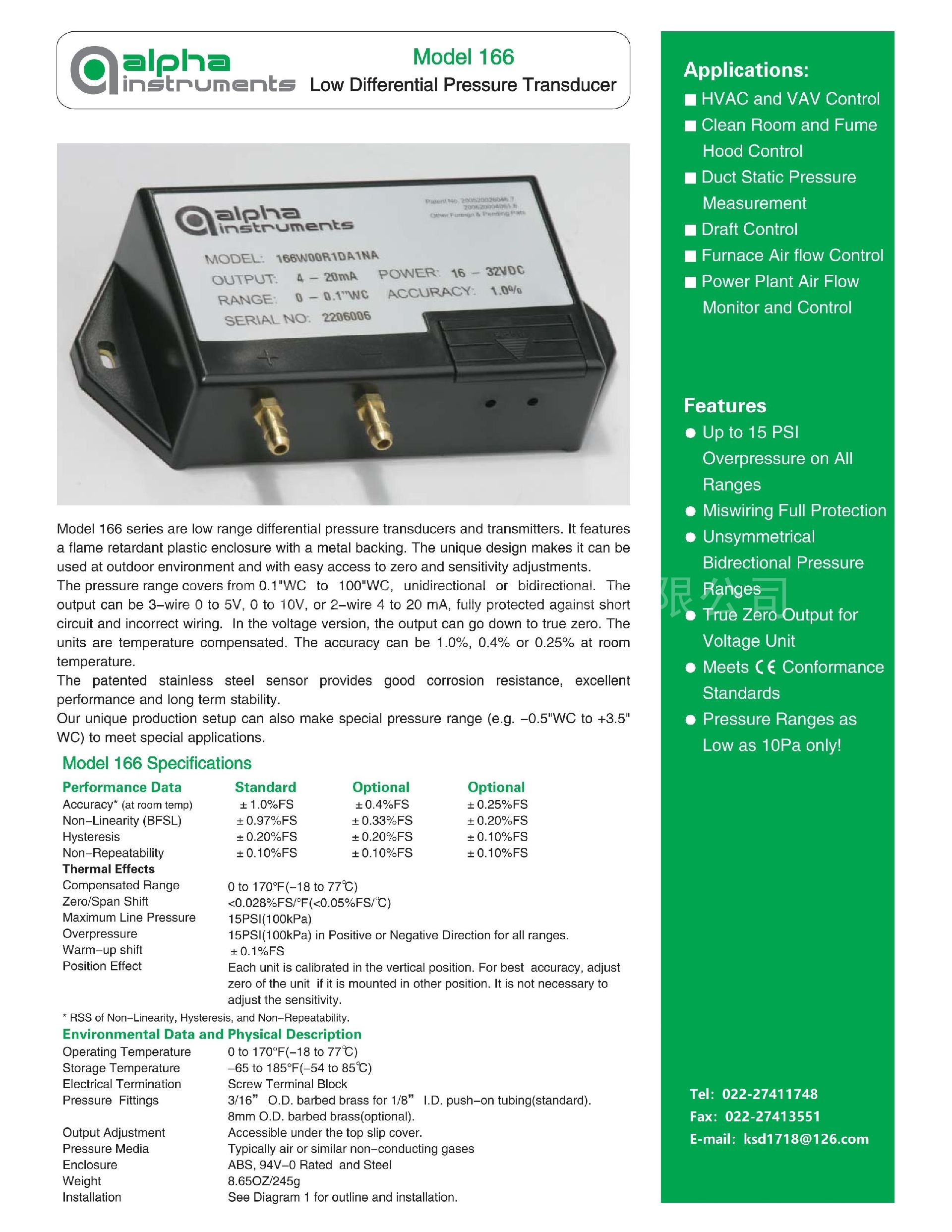 产品特性:166P0100BA1NB,alpha微差压变送器,alpha微差压传感器,微差压变送器
