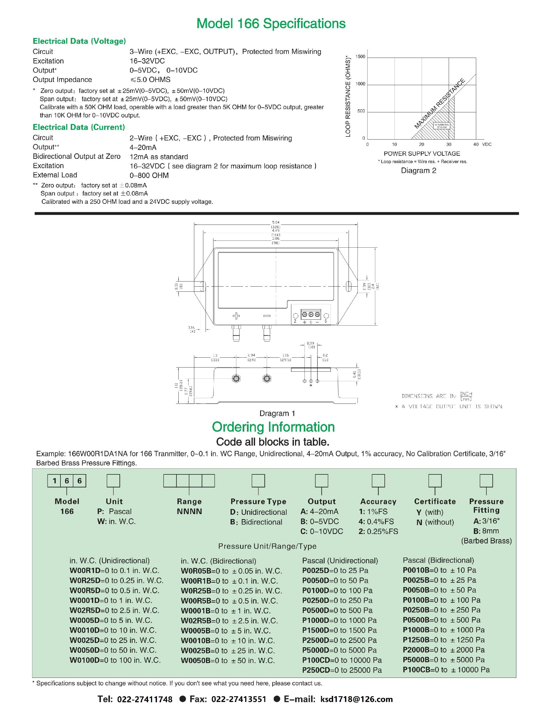天津凯士达精品系列产品alpha压力变送器166P0100BA2NA ±100PA 微差压传感器/变送器,量程为0-±100PA,166系列微差压传感器的核心部件是一个电容式压力敏感元件,由不锈钢膜片与固定电极构成一个电容,其值随压力变化而变。产品可用来测量差压或表压,输出为0-5V,0-10V,4-20mA,也可以特制为其他输出,在室温下精度为±1.0%FS,0.4%FS 或0.25%FS。温度补偿范围在-5~+75℃,温度影响小于±0.05%FS/℃。广泛应用于暖通空调,环境污染控制,洁净工程,医疗仪器及设备,烘箱增压及炉膛风压控制,天然气、煤气管网监测,井下通风和电厂风压监测等领域。