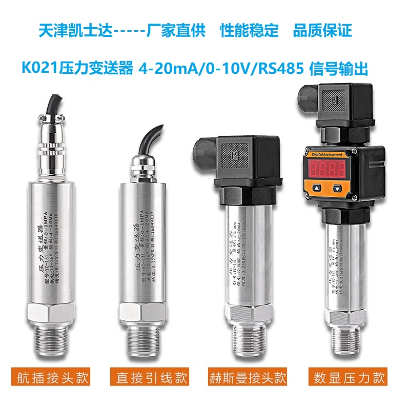 天津凯士达系列产品K021一体式压力变送器1.0MPa 10bar 1.6mpa 负压传感器4-20mA,选用高精度、高稳定性芯片,采用不锈钢外壳及应力隔离技术组装而成,经精密温度补偿、放大处理,传换成4~20mA标准信号,体积小巧、便于安装;适用气体、液体绝对压力和表压力。与二次仪表、PLC工业计算机或集散系统连接实现过程自动测量控制;广泛应用于空压机械、油压机械、锅炉供回水压、空压机、各式泵类及液压油压气压系统的压力测量。 现场显示控制,选配4-20mA可宣传信号,可接入声光报警装置超压报警