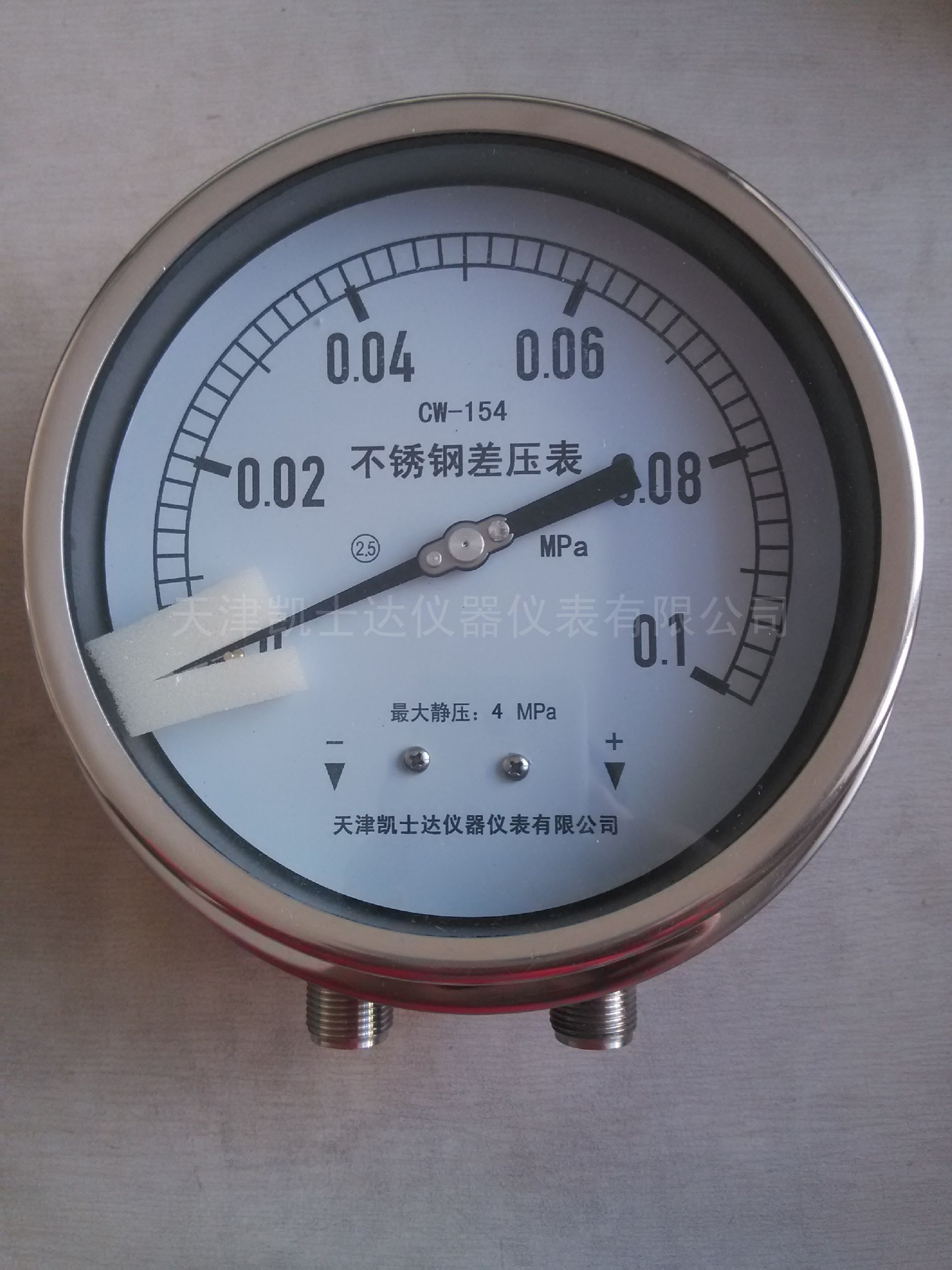 天津凯士达系列产品膜片式差压表CW154-0.1-1-P 0-0.1MPa 工作压力:0-1MPa 安装支架,选配三阀组,不锈钢差压表,耐震不锈钢压差表,适用于测量同一压力源或不同压力源的气体、液体或蒸汽等介质的压力差,并可用于对感压元件无腐蚀作用的腐蚀性介质。采用双波纹管感压,并配有温度补偿及单侧过载保护装置,具有感压精度高,稳定性好,工作压力高等优点。适用于高静压、低差压系统的差压测量。